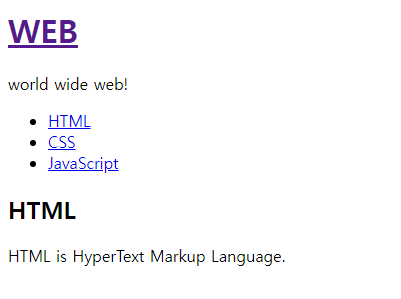 WEB을 누르면 welcome 메시지가, 각 목차를 누르면 그에 해당하는 내용이 뜨도록 만들 것이다.