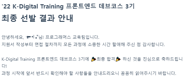 그래서 1솔인 나는 기대를 안하고 있었는데 운 좋게도 합격했다! 모두가 말하지만 역시 코테보단 자기소개서가 매우 중요한 것 같다. 데브코스에서도 안내 메일에서 항상 '열심히 교육받고자 하는 사람을 뽑는다' 라는 것을 강조했었다.