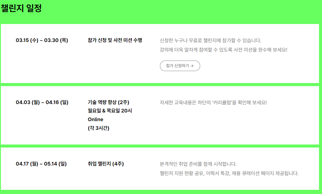 챌린지 일정은 위의 사진처럼 진행되었다.