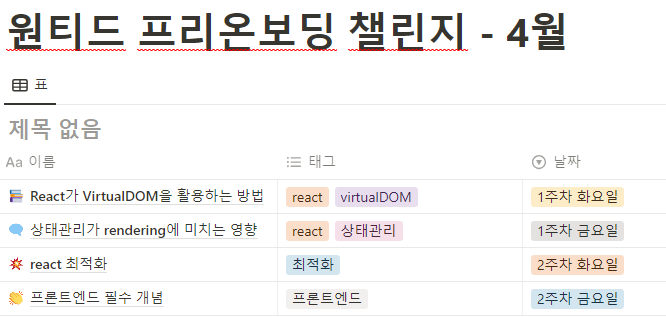 지인의 소개로 원티드 프리온보딩을 알 게 되어 4월 챌린지에 참여하였었다.