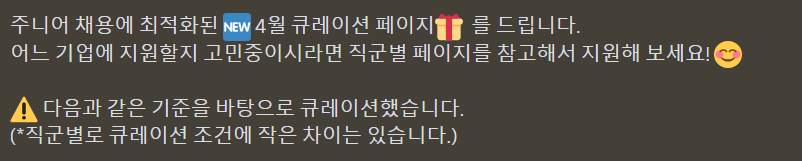 기간동안 모든 챌린저의 지원현황, 서류합격률 등에 대해 주차마다 공지가 있었고 주니어들을 적극적으로 채용하는 회사들을 모아 큐레이션 페이지를 제공하기도 했다.