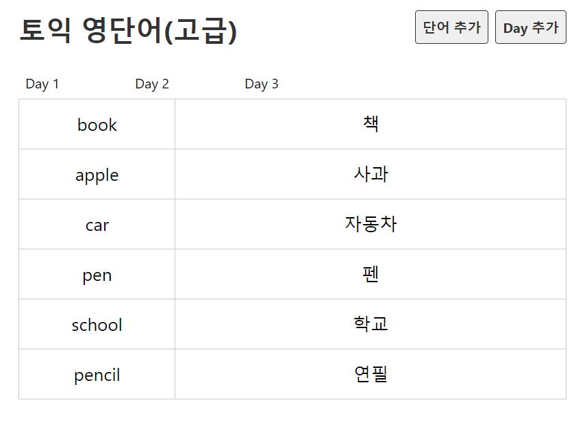 첫 번째는 모든 단어가 다 나오고 있다는 것이다. Day 1을 클릭하면 Day 1에 해당하는 단어들만 보이도록 해야 한다.
