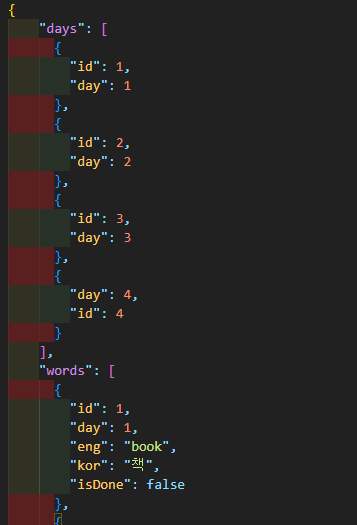 이렇게 뜬다. 이제 이 밑에 day 별로 영단어를 확인할 수 있도록 해야 하는데 그러기 위해선 day별 영단어를 json으로 더미 데이터를 구현해야 한다.