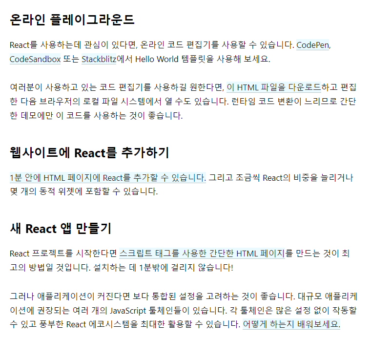 online Playgrounds : 온라인 상에서 리액트를 구현할 수 있음. 코드 샌드박스 등...