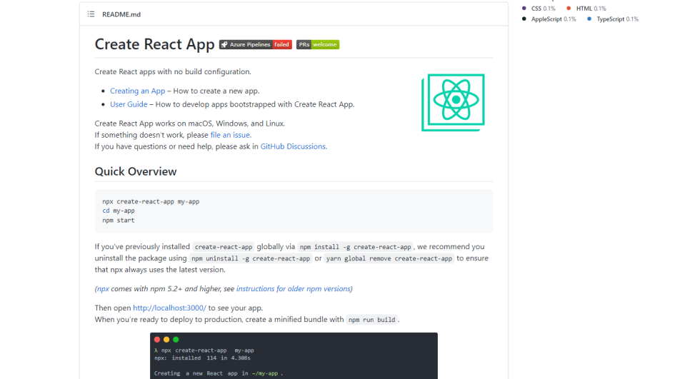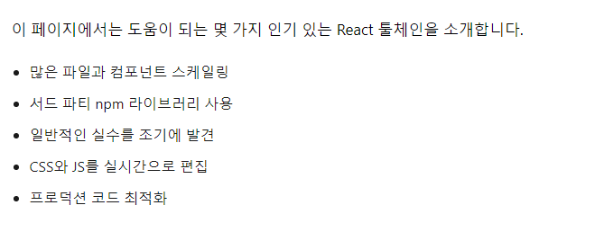 Create a New React App: "Tool Chain" 이라고 해서 리액트로 개발을 할 때 목표 달성을 위해 필요한 여러 가지 개발환경, 도구 등을 모아서 제공해주는 도구이다.